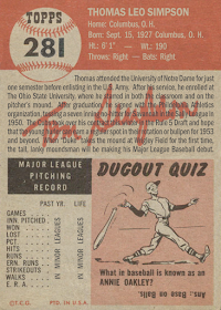 As you can tell, I wrote it up as it might read had he actually occupied a slot in the second offering of Topps' checklist.  After making the team out of spring training in '53, Simpson stuck with the Big club all season, making 30 appearances coming mostly out of the bullpen.  All told, his next theoretical baseball card would show a 1-2 record, with an 8.00 ERA in 40 innings for his only MLB season.